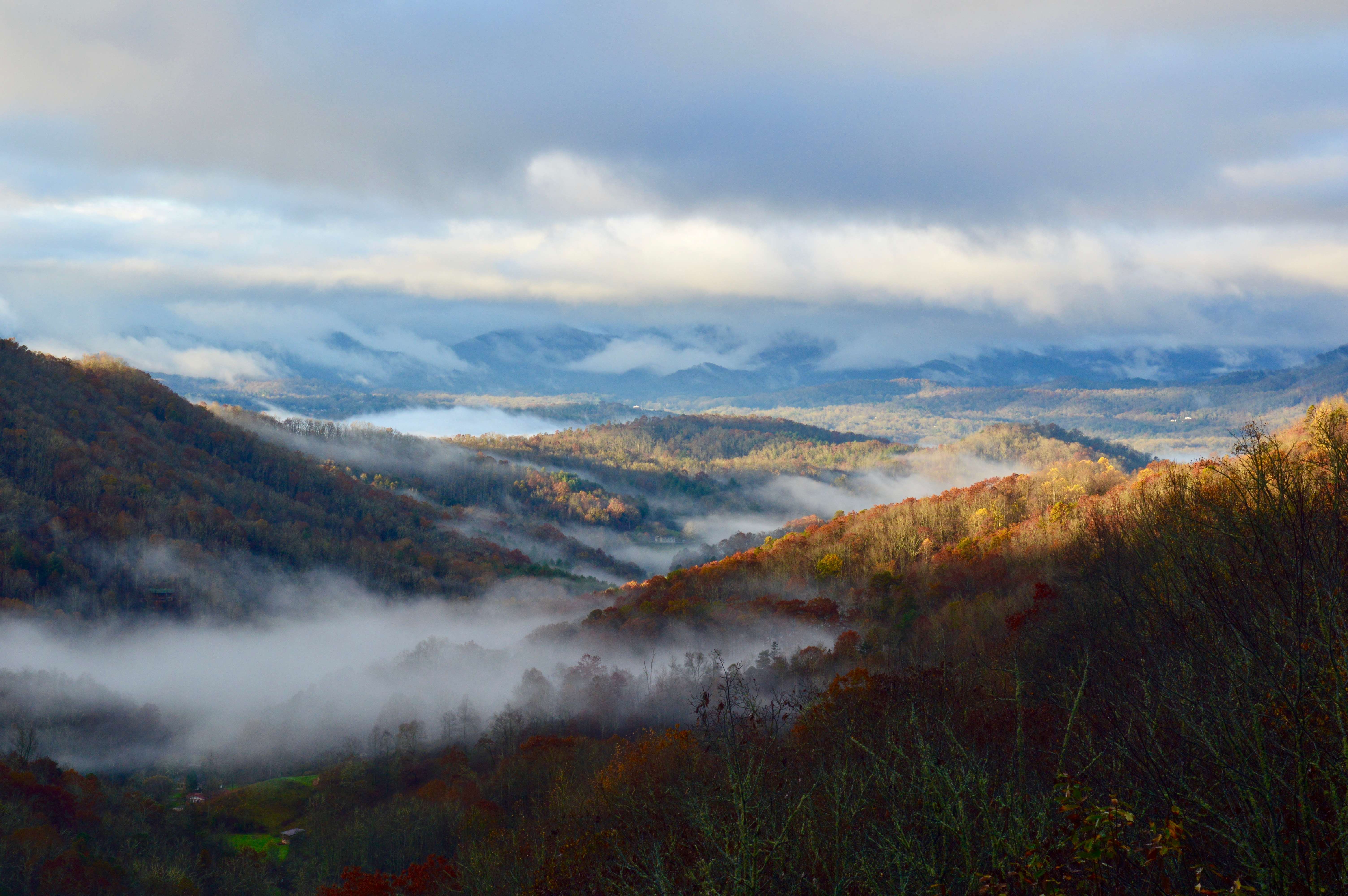 Great Smoky Mountains, North Carolina USA. This photo was taken from my home in November of 2015. A rain had just passed through and the afternoon sunlight was poking through the clouds illuminating the Fall leaves. [6000x4000]