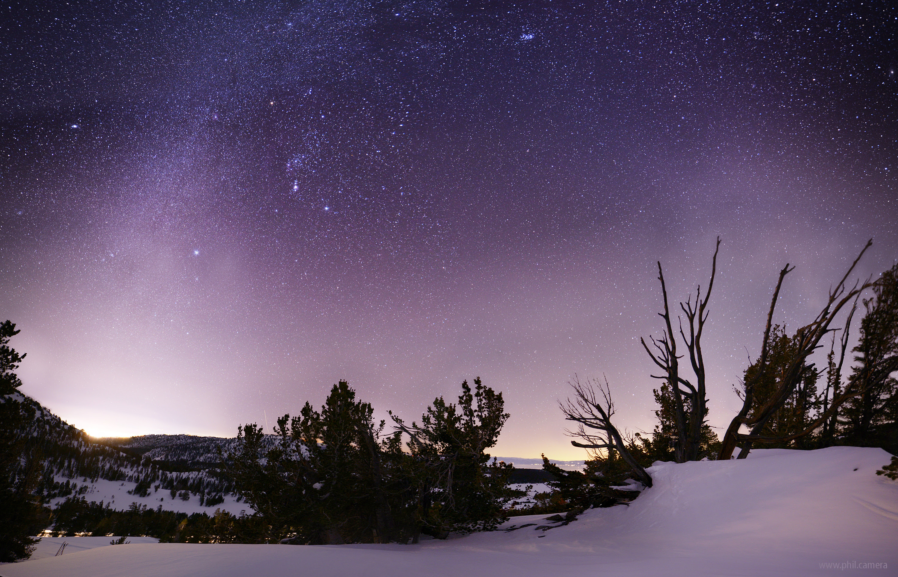 Winter Night Sky over The Mt Rose / Sheep Flat meadow last night, with Carson down to the left and Lake Tahoe peaking through the branches center-right. One of the most technically challenging photos I've ever taken. [oc][3000x1928]