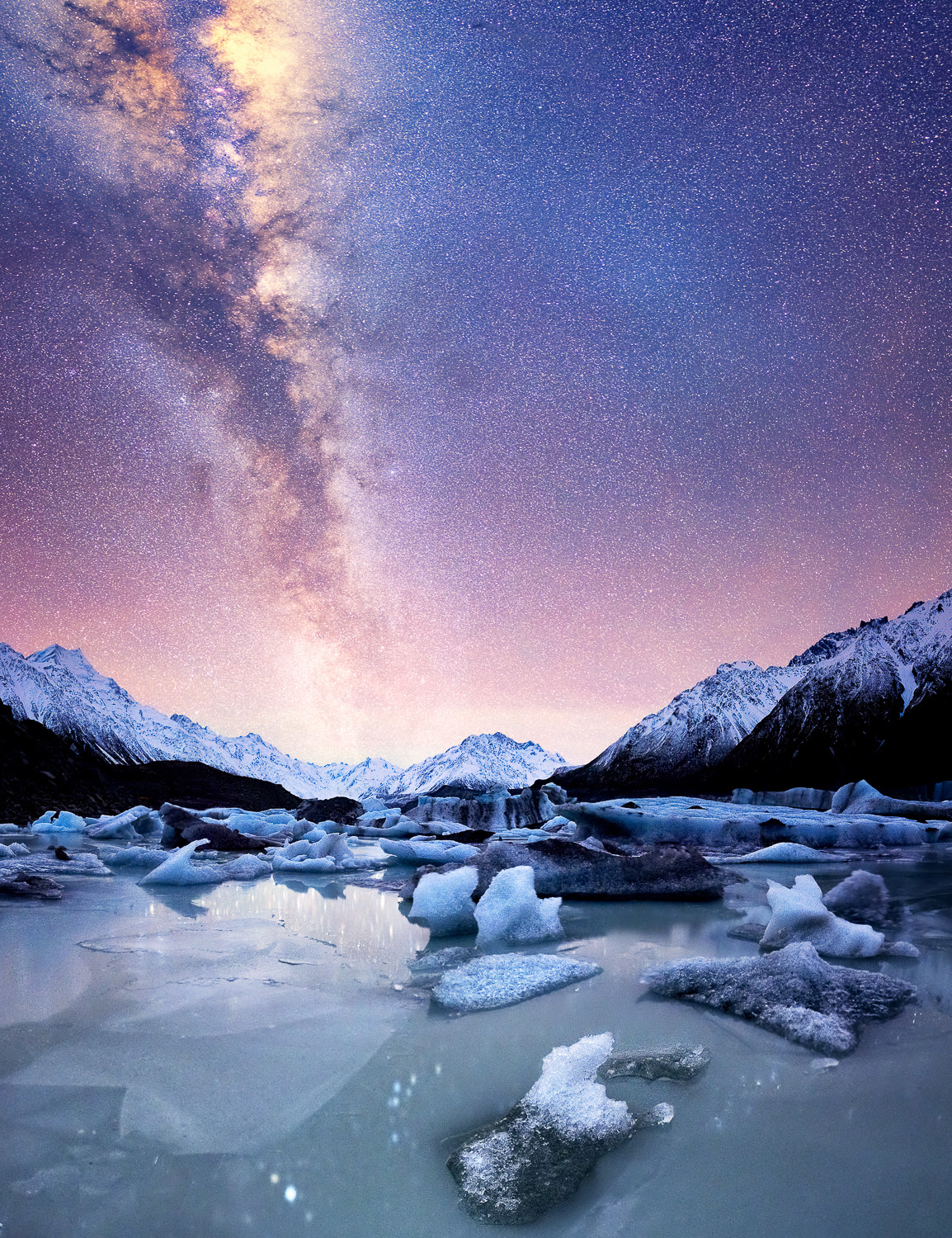 Perfectly clear night spent looking at the stars in front of ice bergs. Tasman Lake, NZ. [OC] [1154 x 1500] @south_of_home